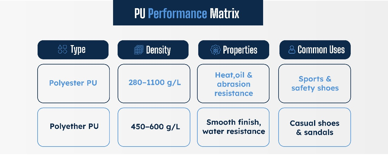 Within PU systems, two broad families, i.e., polyether-based and polyester-based polyurethanes, define most footwear applications. While both fall under the PU umbrella, their internal chemistry leads to very different performance outcomes on the ground.